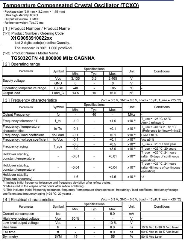 X1G005391002200 | TG5032CFN | 40.000000 MHz | 5.00 x 3.20 x 1.45 mm | CMOS | 3.135 to 3.465 V | +/-1.0 ppm | -40 to ++85 °C |
