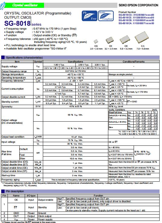 X1G005601021600 | SG-8018CG | 5.000000 MHz | 2.50 x 2.00 x 0.80 mm | CMOS | 1.620 to 3.630 V | -40 to 105 °C | +/-50 ppm |