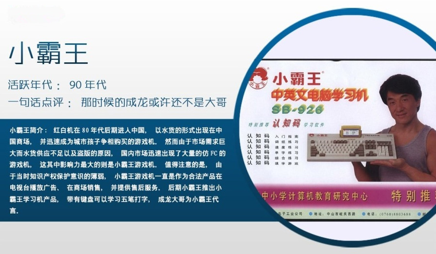 小霸王游戲機(jī)一聽就很熟悉吧,在那個(gè)年特別火,而且是于成龍代言的,那時(shí)候的成龍或許還不是大哥,小霸王游戲機(jī)一直是作為合法產(chǎn)品在電視臺播放廣告、在商場銷售,并提供售后服務(wù)。后期小霸王推出小霸王學(xué)習(xí)機(jī)產(chǎn)品,帶有鍵盤可以學(xué)習(xí)五筆打字,成龍大哥為小霸王代言。