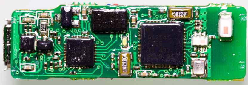 現(xiàn)在就來(lái)拆拆手環(huán)主機(jī)了,由于手環(huán)外殼采用熱熔接方式,要拆開(kāi)手環(huán)只能采用暴力方式拆解.揭開(kāi)外殼,可以看到智能手環(huán)主機(jī)電路板和零件,從MicroUSB膠塞固定位置上可以看到膠塞頭并沒(méi)有完全密封起來(lái),如果游泳時(shí)帶著這個(gè)手環(huán)進(jìn)入水中可能會(huì)導(dǎo)致進(jìn)水..jpg)