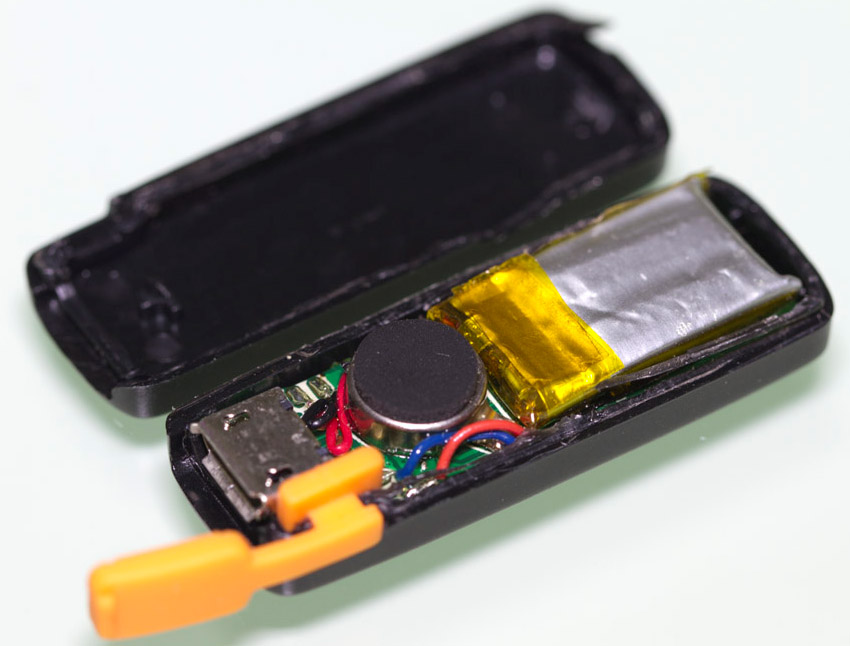 現(xiàn)在就來(lái)拆拆手環(huán)主機(jī)了,由于手環(huán)外殼采用熱熔接方式,要拆開(kāi)手環(huán)只能采用暴力方式拆解.揭開(kāi)外殼,可以看到智能手環(huán)主機(jī)電路板和零件,從MicroUSB膠塞固定位置上可以看到膠塞頭并沒(méi)有完全密封起來(lái),如果游泳時(shí)帶著這個(gè)手環(huán)進(jìn)入水中可能會(huì)導(dǎo)致進(jìn)水.