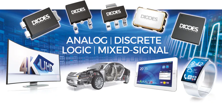 Diodes 的產品包括二極管、整流器、晶體管、MOSFET、GPP橋、GPP整流器、保護裝置、特定功能數組、單閘極邏輯、放大器與比較器、霍爾效應與溫度傳感器、電源管理設備,包括AC-DC 轉換器與控制器、DC-DC 開關與線性穩壓器,以及電壓參考與LED驅動器;以及特殊功能裝置,例如 USB 電源開關、負載開關、電壓監控器及馬達控制器。Diodes 亦提供高速信號的定時、連接、開關與信號完整性解決方案。