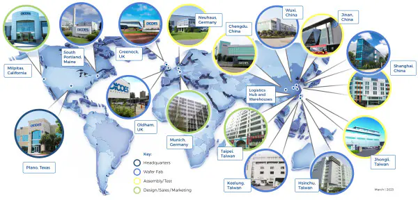 Diodes 公司總部及美洲銷售辦公室位于美國德州普拉諾 (Plano) 與加州米爾皮塔斯 (Milpitas)。設計、營銷與工程中心位于普拉諾、米爾皮塔斯、臺北、桃園、竹北、上海、揚州、英國奧爾德姆及德國紐豪斯 。Diodes 的晶圓生產設施位于美國緬因州南波特蘭;英國格林諾克奧爾德姆;中國上海和無錫;還有基隆和新竹。Diodes 在中國上海、濟南、成都、無錫、中壢和基隆以及德國紐豪斯設有組裝與測試設施。另外在多個據點設有工程、銷售、倉儲及物流辦公室,包括臺北、香港、上海、深圳、武漢、揚州;英國奧爾德姆;南韓城南市以及德國慕尼黑、法蘭克福,并于世界各地設有支持辦公室。