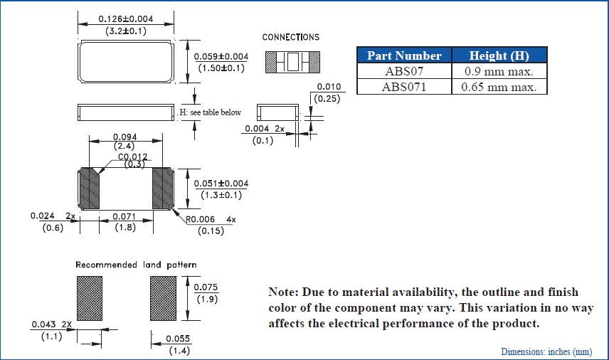 ABS07-32.768KHZ-7-T | Abracon LLC | ABS07 | kHz Crystal | 32.768kHz | 2-SMD, No Lead | 0.126" L x 0.061" W (3.20mm x 1.50mm) | 0.035" (0.90mm) |