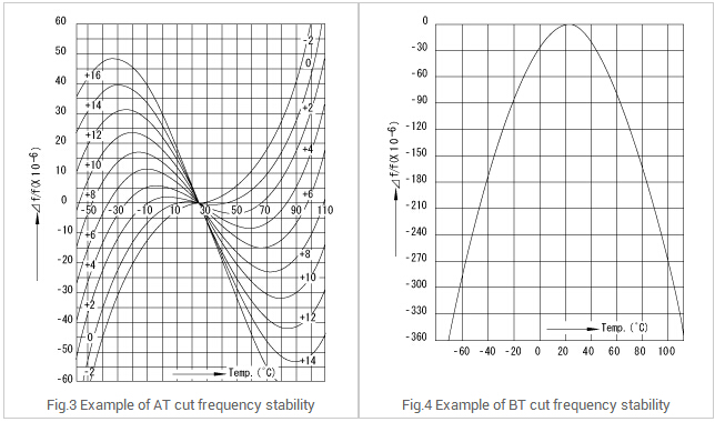 根據曲線的形狀,將晶體的頻率溫度特性分為2類.一個是三次曲線,另一個是二次曲線.典型的頻率溫度特性和BT削減在圖3和圖4所示,分別.在切晶體單元中最廣泛使用的是因為它們在室溫范圍內產生較小的頻率變化響應溫度變化.