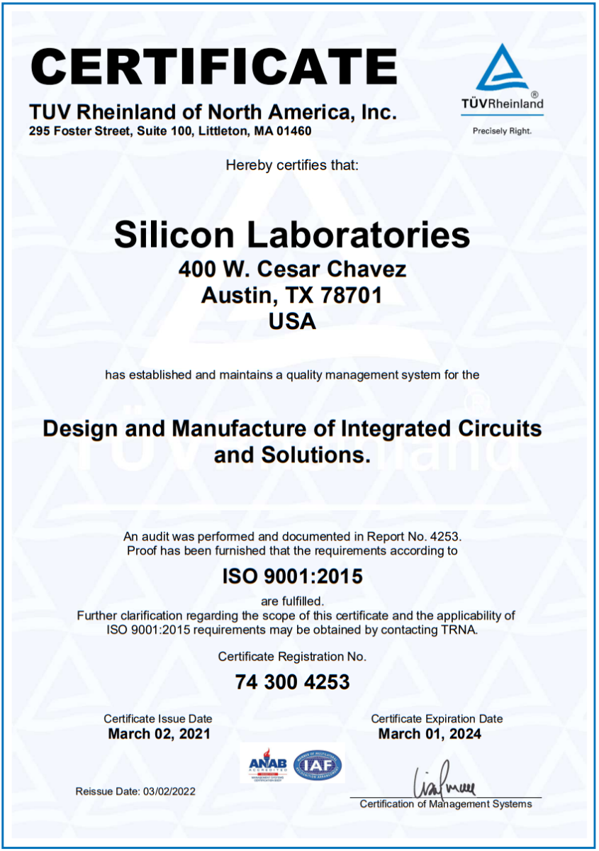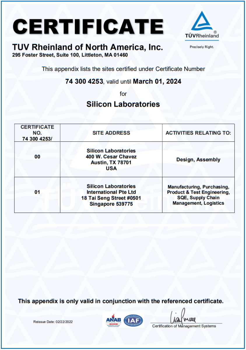 要求卓越的質量的Silicon晶振通過ISO9001認證標準,可持續發展是Silicon晶振一切工作不可或缺的一部分,努力減少資源使用,減少生產過程對環境的影響,并提供符合環境法規和要求的產品。Silicon晶振要求卓越的質量和環境管理體系,每個體系都分別通過了認證ISO 9001:2015 認證標準。Silicon Labs是EPA綠色電力合作伙伴,致力于在可用的情況下增加對可再生能源的使用。Silicon采用積極主動的計劃來減少辦公室用水量,并采取措施提高回收和電子處置選項的可用性,從而提高我們的轉化率。