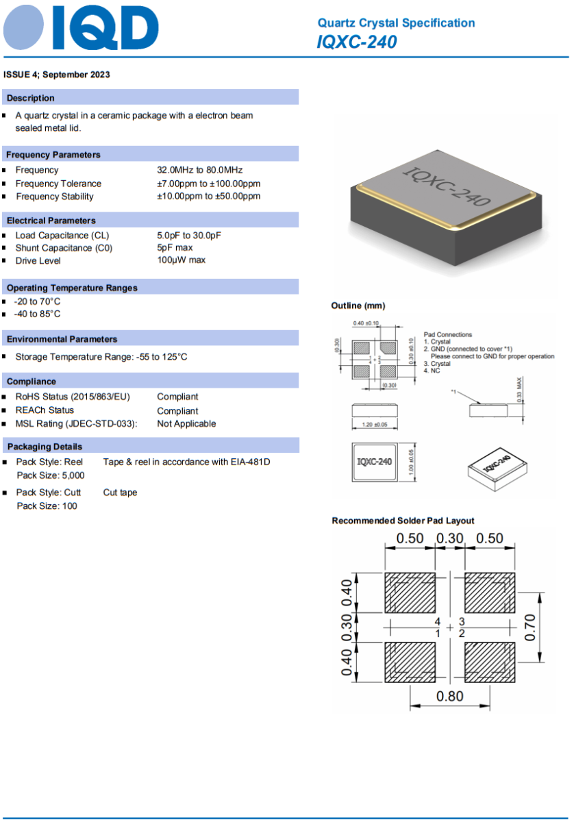 Housed in a 4-pad ceramic hermetically sealed package with an electron beam sealed metal lid, which helps to minimise the EMI radiation. The product is designed to be able to withstand shock levels of up to 1000G in accordance with IEC 60068-2-27. The IQXC-240 is available on tape and reel in accordance with EIA-481D.技術(shù)支持