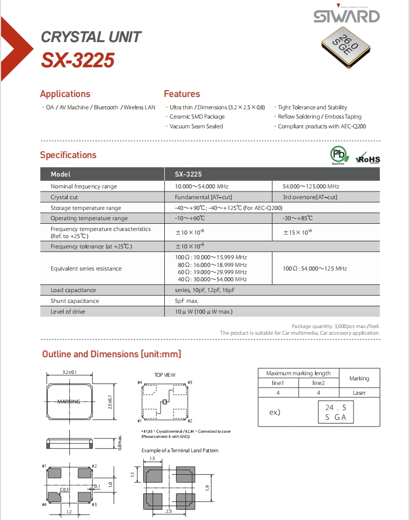 XTL571100-N98-008 | Siward晶振 | SX-3225 | 25 MHz | ±10ppm | 20pF | -20 ℃~75 ℃ |