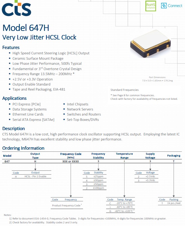 CTS型號(hào)647H是一款低成本、高性能的時(shí)鐘有源晶體振蕩器,支持HCSL輸出。采用最新集成電路M647H具有良好的穩(wěn)定性和低相位抖動(dòng)性能。
